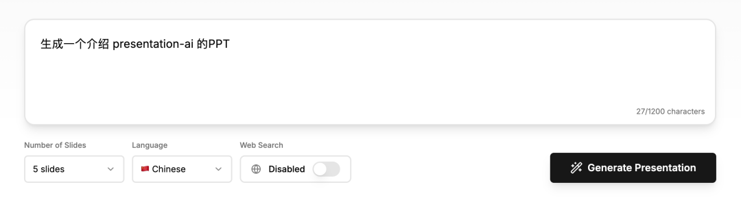 在输入框中简单描述 PPT 制作需求(如「生成一份产品发布会的 PPT」「介绍人工智能发展的课件」),然后选择幻灯片数量、生成语言,按需开启 / 关闭网页搜索功能,点击「Generate Presentation」即可触发生成。