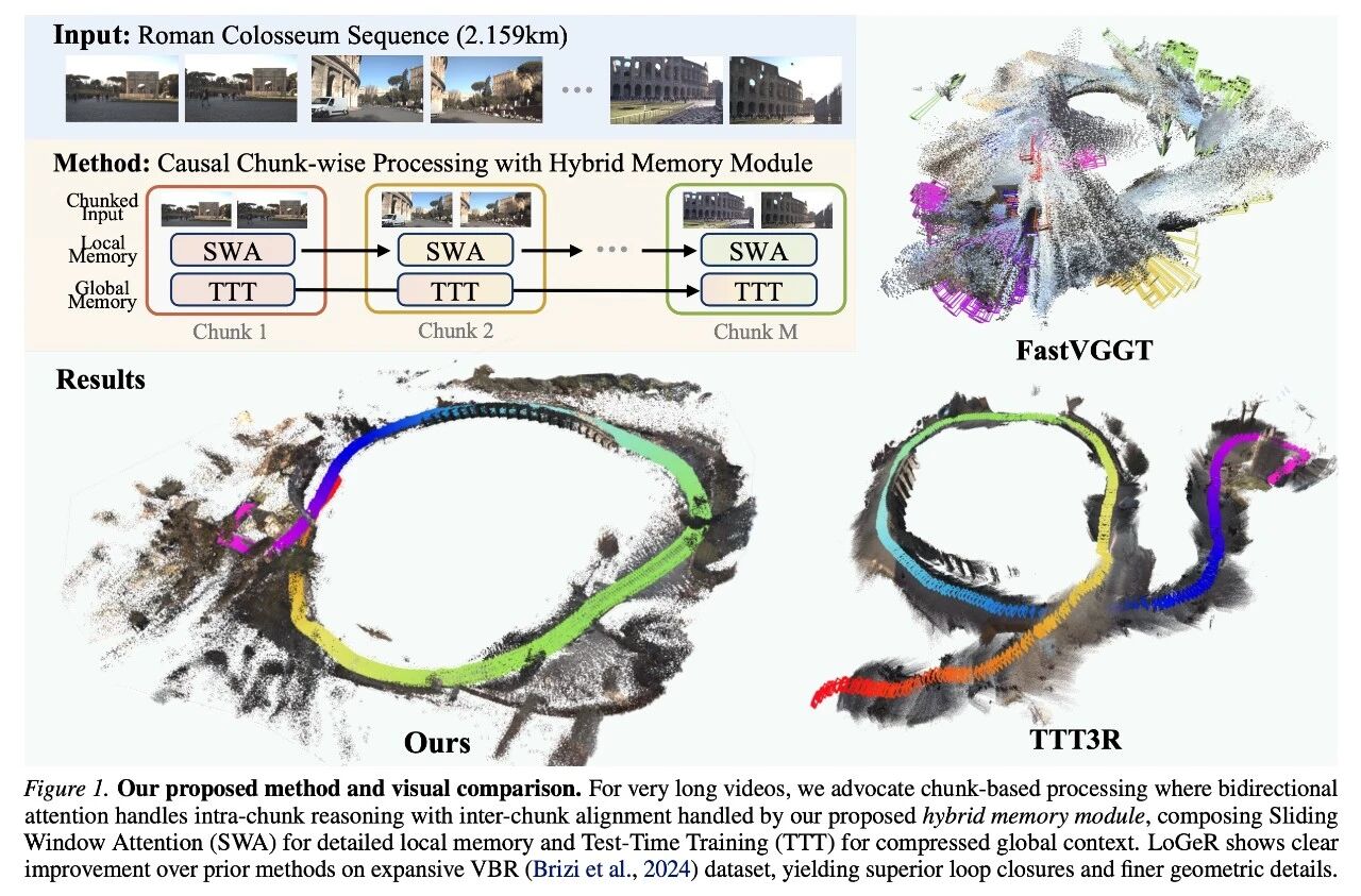 这两大壁垒导致传统前馈模型难以兼顾 “长序列处理” 与 “高保真重建”,而 LoGeR 的出现,正是通过混合记忆架构与数据策略创新,同时打破了这两道枷锁。