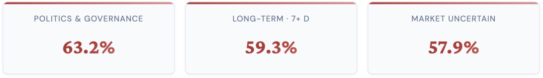 市场不确定区间(人类信心 55%-70%):胜率 57.9%,人类犹豫时 AI 的概率校准能力更显稳健。