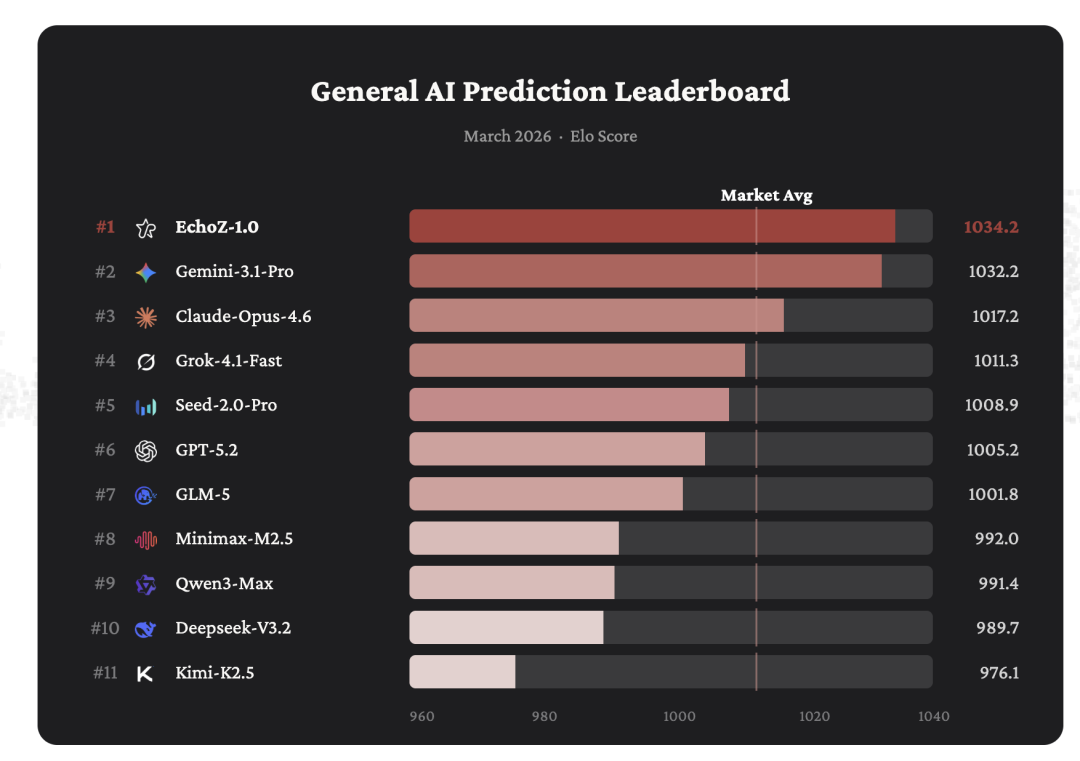 2026 年 3 月的 General AI Prediction Leaderboard 数据显示,EchoZ-1.0 以 Elo 1034.2 的高分位列第一,领先 Google Gemini-3.1-Pro(1032.2)和 Anthropic Claude-Opus-4.6(1017.2)。这份覆盖政治、经济、体育、科技等 7 大领域、包含 1000 + 道活跃题目的榜单中,EchoZ-1.0 的优势不仅在于分数,更在于极致的稳定性: