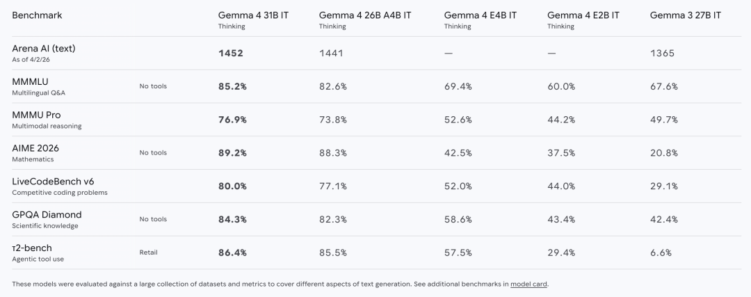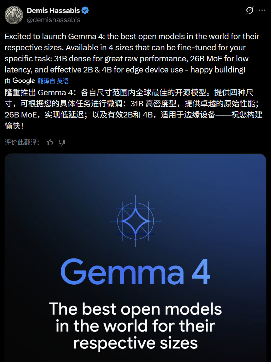 而 Gemma 4 全系采用Apache 2.0 开源许可证,彻底消除了商用顾虑:开发者可自由商用、魔改模型、二次分发,谷歌无权单方面变更规则,与阿里 Qwen、DeepSeek 等主流开源模型的协议标准保持一致,真正实现了 “拿过来就能用” 的自由开源体验。Hugging Face CEO Clément Delangue 直言,这是 “里程碑式的进步”。