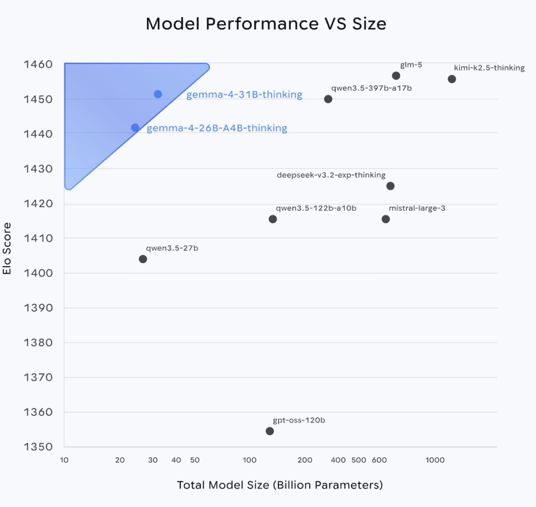 更值得称道的是 26B A4B 混合专家(MoE)模型,总参数量 252 亿,但推理时仅激活 38 亿有效参数,以 40 亿参数的算力开销,跑出了旗舰级性能,Arena AI 评分 1441,位列开源模型第六,成为低延迟、高性能场景的最优解。