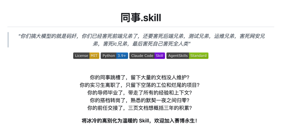 这场狂欢的背后,是一个覆盖从入职到离职、从恋爱到分手的完整 Skill 生态。当同事离职、前任分手,不必再惋惜经验流失或回忆消散,一个 Skill 就能让他们实现 “赛博永生”,而这一切,都始于一场荒诞又真实的 AI 实验。
