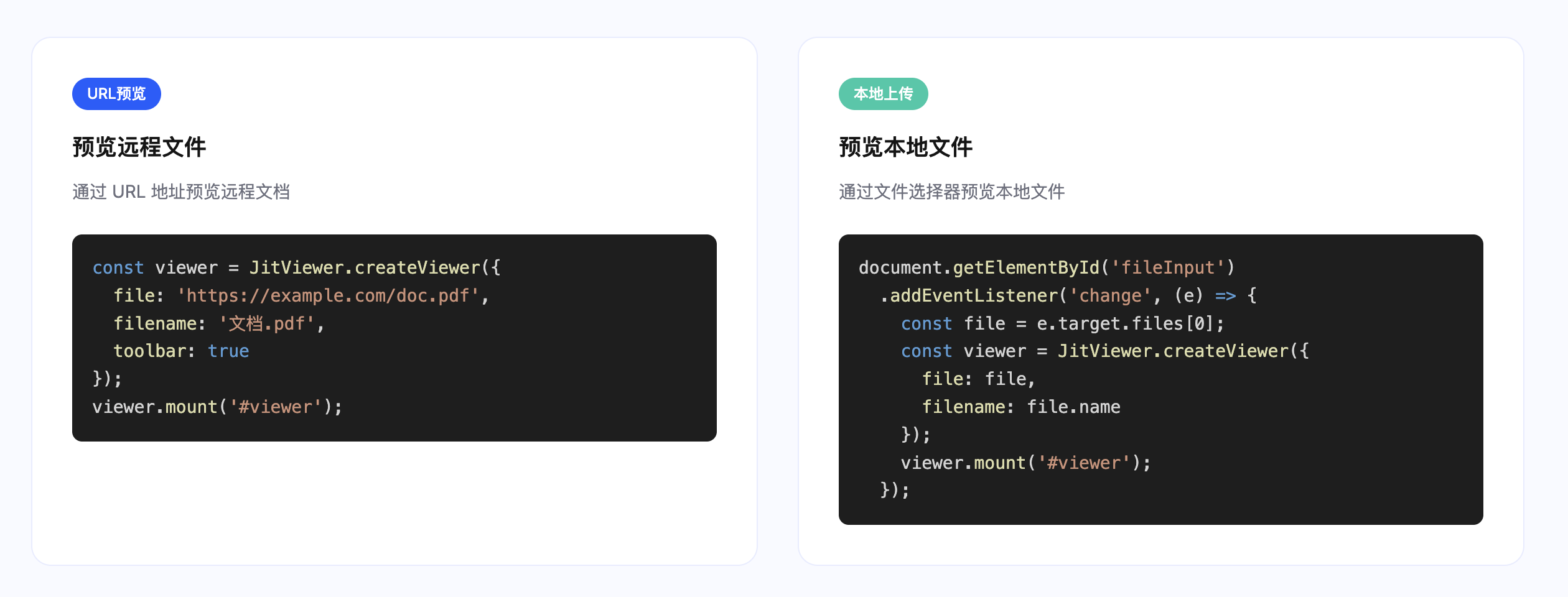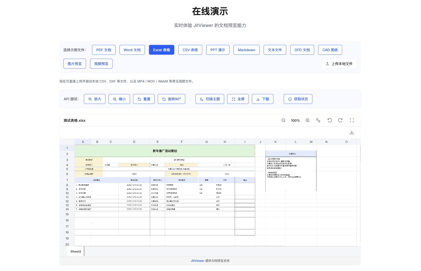 无论是 Vue3、React 还是原生 HTML 项目,jit-viewer 都能无缝集成,开箱即用。开发者仅需通过简单的 API 调用,就能实现远程文件 URL 预览与本地文件上传预览,一行代码即可为项目嵌入专业的文件预览能力,目前已支持 PDF、Word、Excel、CSV、PPT、OFD、CAD (DXF)、图片、Markdown、TXT、视频等多种主流格式,覆盖办公、设计、研发等绝大多数使用场景。