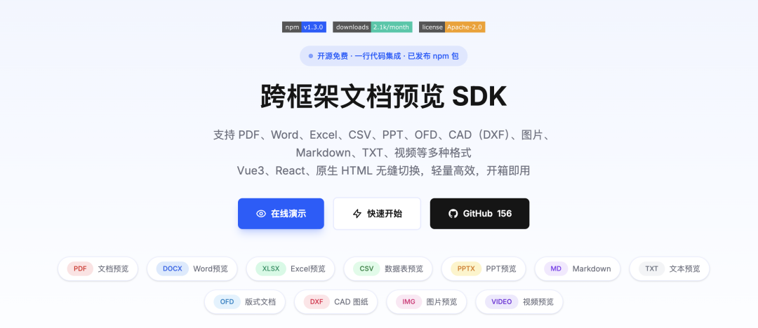作为一款专注于落地的开源工具,jit-viewer 自两周前发布以来,凭借轻量高效、跨框架兼容的特性迅速出圈,目前在 npm 上已有 2.1k 的月下载量,支持 Apache-2.0 开源协议,可免费商用。它是一款纯前端文件预览引擎,核心思路是将文件解析能力完全搬到浏览器端,彻底摆脱了对微软、Google 在线接口的依赖,也无需企业自建昂贵的文件转换服务器,从根源上解决了传统预览方案的隐私风险与成本问题。