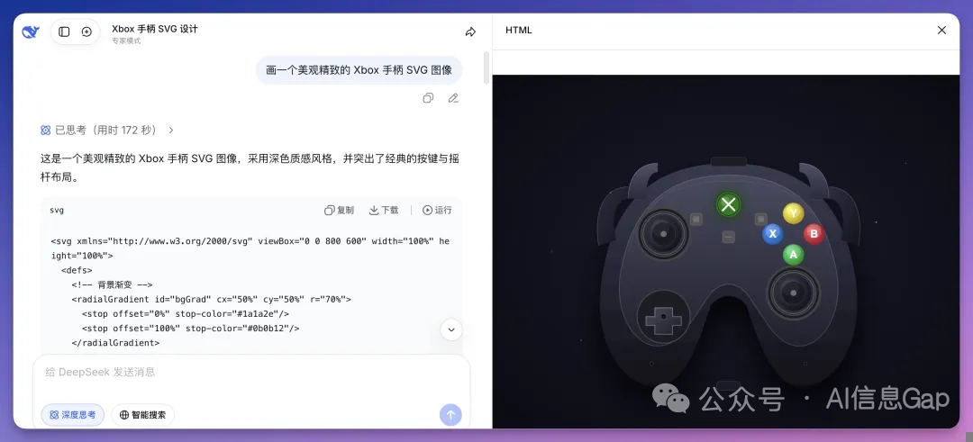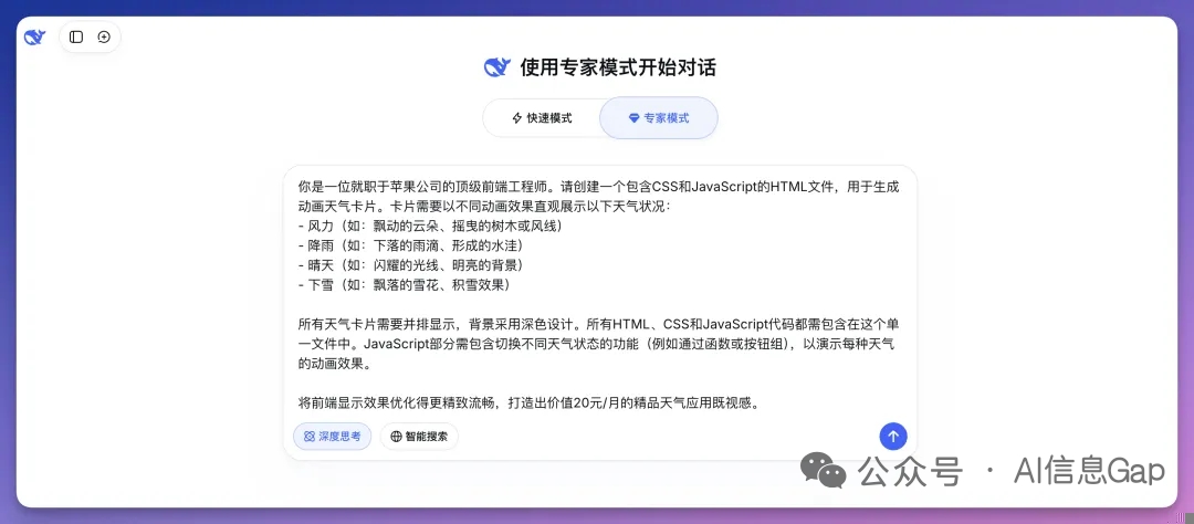 实测中,专家模式的思考时间明显延长,复杂任务耗时从几十秒到近三分钟不等:生成Xbox手柄SVG耗时172秒,进阶版天气卡片耗时91秒,基础版天气卡片耗时77秒。值得注意的是,该模式目前暂不支持图片和文件上传,推测是为了将算力完全集中在推理能力上,暂未搭载原生多模态功能。