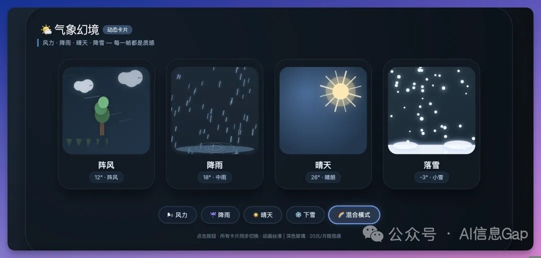 基础版天气卡片:按提示生成包含风、雨、晴、雪四种状态的HTML动画卡片,采用深色设计,四张卡片并排展示,底部配备切换按钮和温度标注,雨滴、雪花、光线等动画效果流畅,具备「20元/月精品应用」的既视感,代码结构完整,HTML、CSS与JavaScript集成在单一文件中,可直接运行。