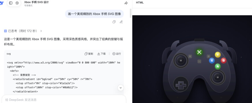 开启「专家模式 + 深度思考」后,DeepSeek 足足思考了 172 秒(近 3 分钟),最终输出的 SVG 图像堪称诚意之作: