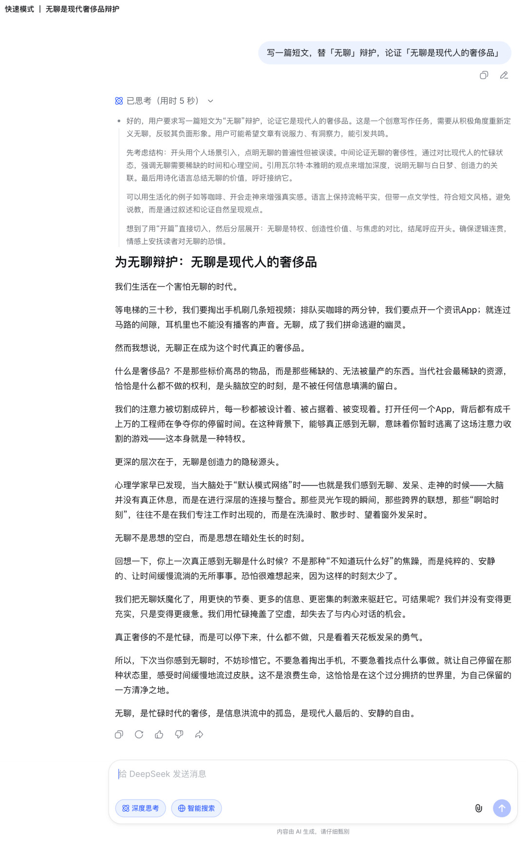 辩论题:「论证无聊是现代人的奢侈品」。专家模式输出更长、逻辑链更完整;快速模式文风相对自然朴实。有意思的是,在创意写作任务上两者速度差距不大——创意写作对模型规模的敏感度远低于数学推理。