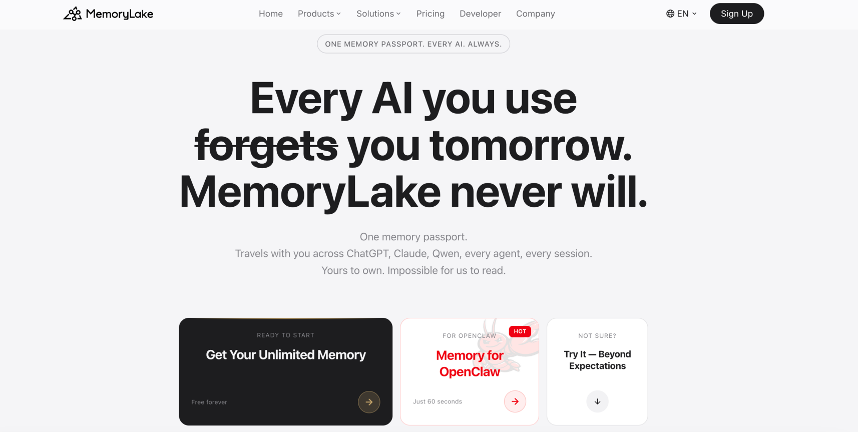 就像护照通行各国不用重复证明身份,你的记忆在 OpenClaw、ChatGPT、Claude、Qwen 等任意平台、任意智能体之间无缝迁移、永久保存、自己掌控。