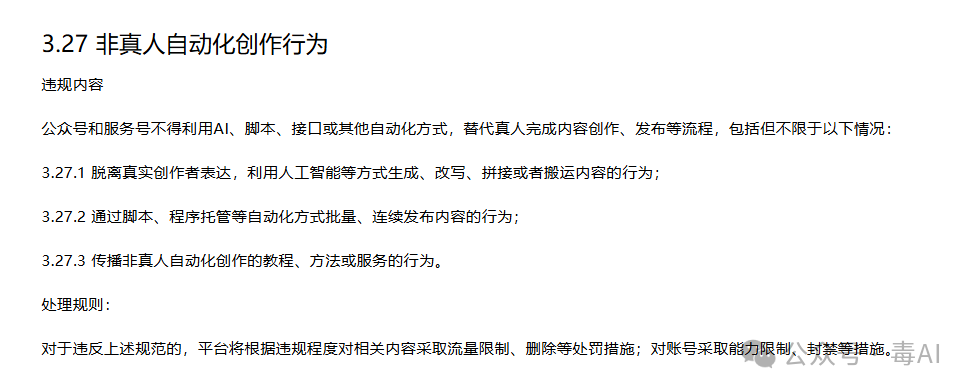 公众号 / 服务号不得利用 AI、脚本、接口或其他自动化方式,替代真人完成内容创作、发布,包括: