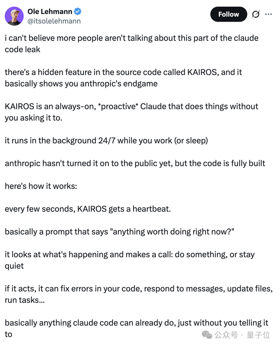 就在全网为 Claude Code 相关开源消息沸腾时,这场堪称 “史诗级翻车” 的代码泄露,让 Anthropic 压箱底的技术布局彻底暴露。开发者团队在拆解超 51 万行源代码的过程中,由 Ole Lehmann 率先发现了这个足以颠覆 AI 交互形态的隐藏功能,消息一出直接引爆科技圈,连 Karpathy 都直言这是自己观点的最佳佐证。