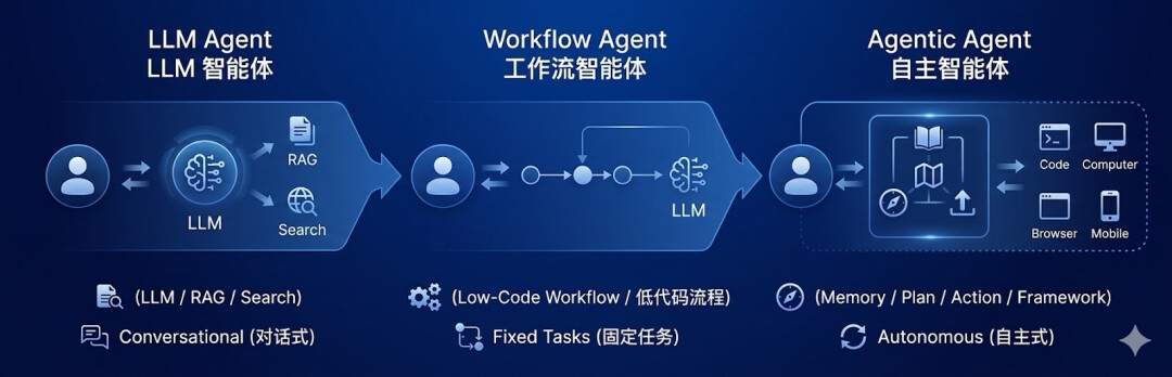 Agentic Agent(自主式):自主规划、动态调用工具、持续与环境交互,真正成为 “数字员工”。