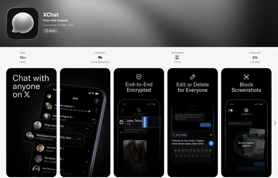 当地时间 4 月 11 日,X 平台正式官宣:XChat 将于 4 月 17 日登陆 App Store,这款被视为 “西方微信” 的即时通讯应用,历经近一年测试、四年布局,即将正式面向 iPhone 与 iPad 用户开放。