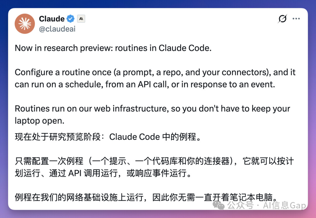 2026 年 4 月 15 日,Anthropic 正式发布 Claude Code 重磅新功能 ——Routines(例程),目前已开放研究预览。