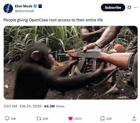 当 AI Agent 从 “尝鲜” 变成上万只批量上岗,状态失控、密钥泄露、越权操作、成本超支、数据不沉淀等风险直接让企业不敢用。马斯克更是直言:把 OpenClaw 开放权限,就像把上膛的枪交给猴子。