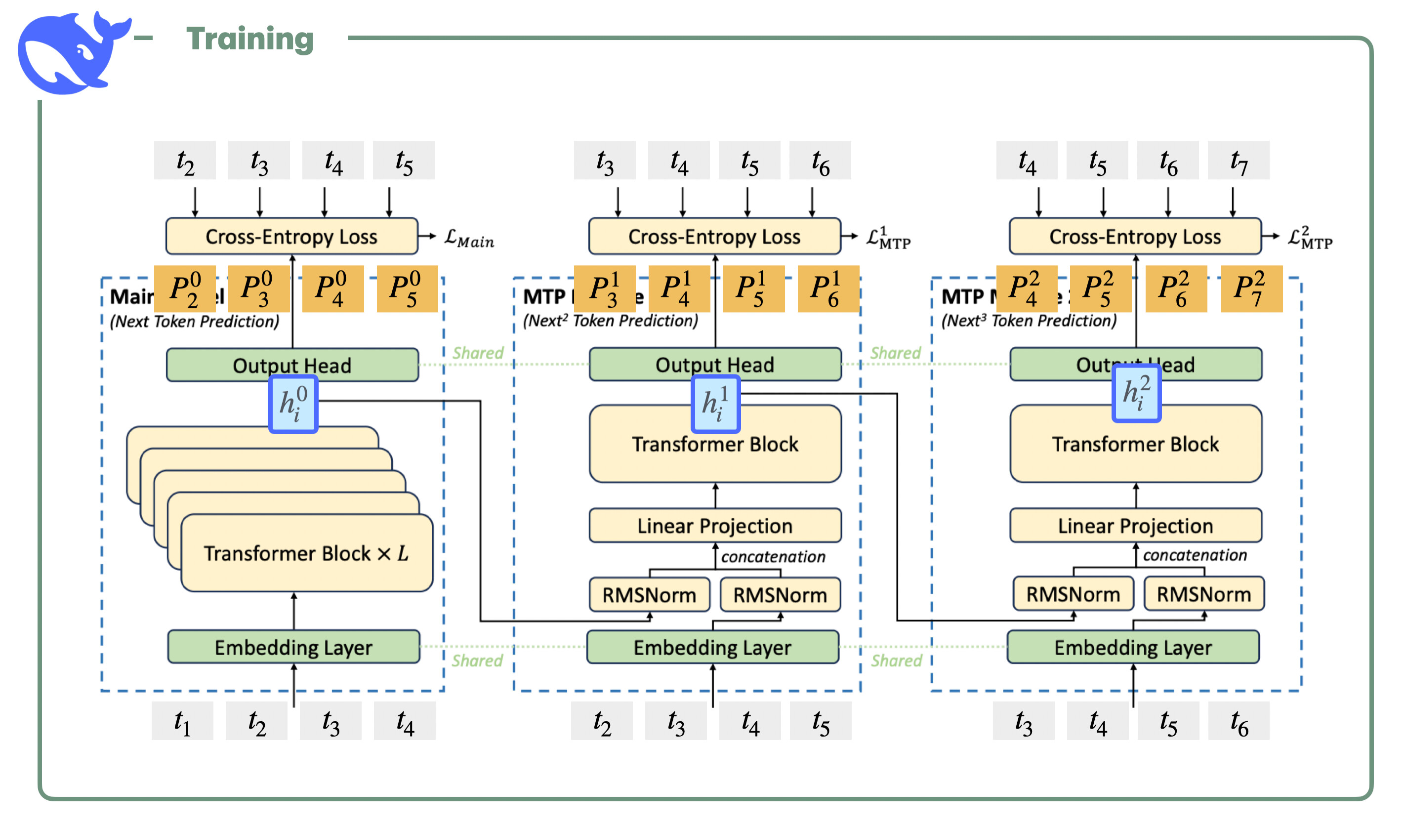 (MTP级联结构:共享嵌入,逐步预测多步)