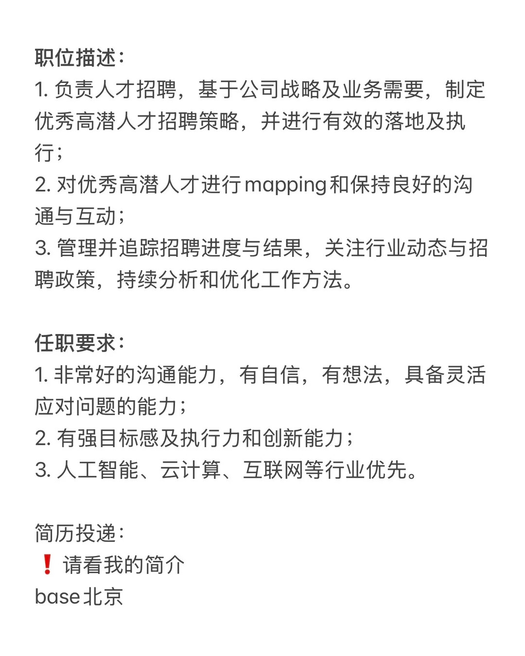 - 有人工智能、云计算、互联网等行业招聘经验者优先。