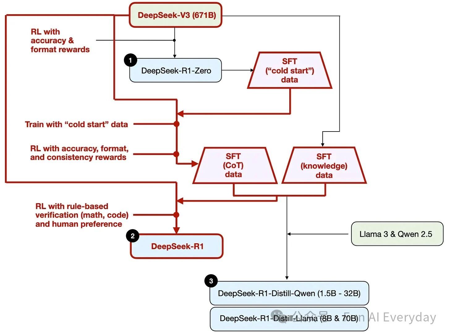 这套流程本质是 “强化版 RLHF”—— 更侧重推理链数据的积累,且依赖客观可验证的奖励反馈,避免主观评分的偏差。
