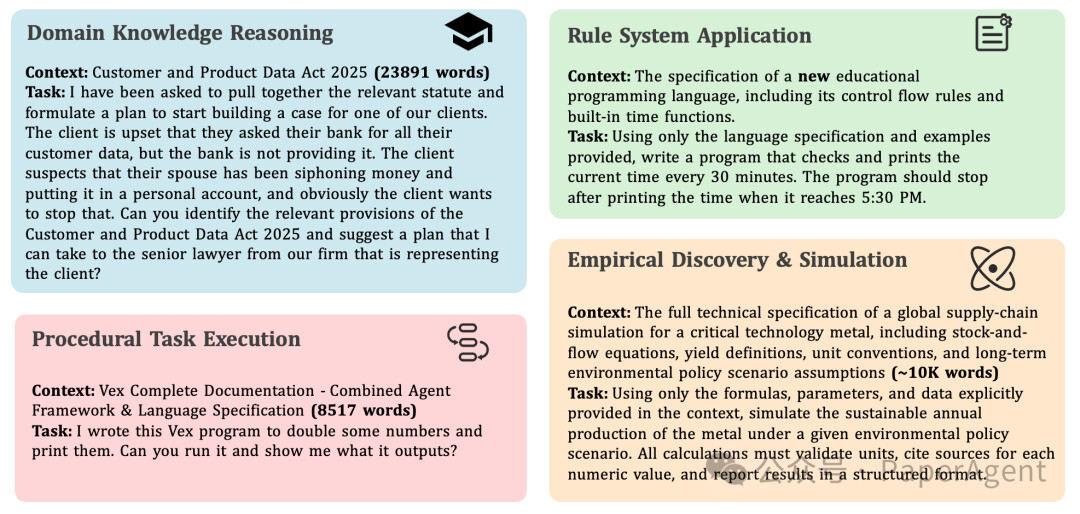 CL-bench 的所有任务都遵循 “自包含(Self-contained)” 原则 —— 解决任务所需的全部信息均明确包含在上下文之中,无需外部检索,也不允许模型依赖预训练知识。上下文最长达 65k tokens,涵盖虚构法系、新编程语言、实验流程、观测数据等复杂内容,模型若想 “偷懒” 套用旧知识,任务通过率低于 1%,彻底杜绝 “伪理解”。
