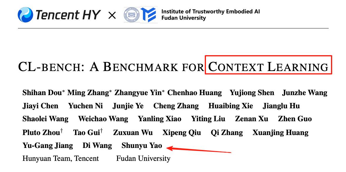 2026 年 AI 领域再添重磅评测基准!腾讯混元团队与复旦大学联合推出专注于 “上下文学习(Context Learning)” 的评测基准 CL-bench,刚加入腾讯不久的首席 AI 科学家姚顺雨(Shunyu Yao)深度参与其中,提供了全面细致的审阅与反馈,极大提升了这项工作的质量。这款基准首次聚焦模型 “现学现卖” 的核心能力,直击现有评测痛点,却让 GPT 5.1、Claude Opus 4.5 等 10 款前沿模型集体折戟,揭示了下一代大模型的关键能力瓶颈。