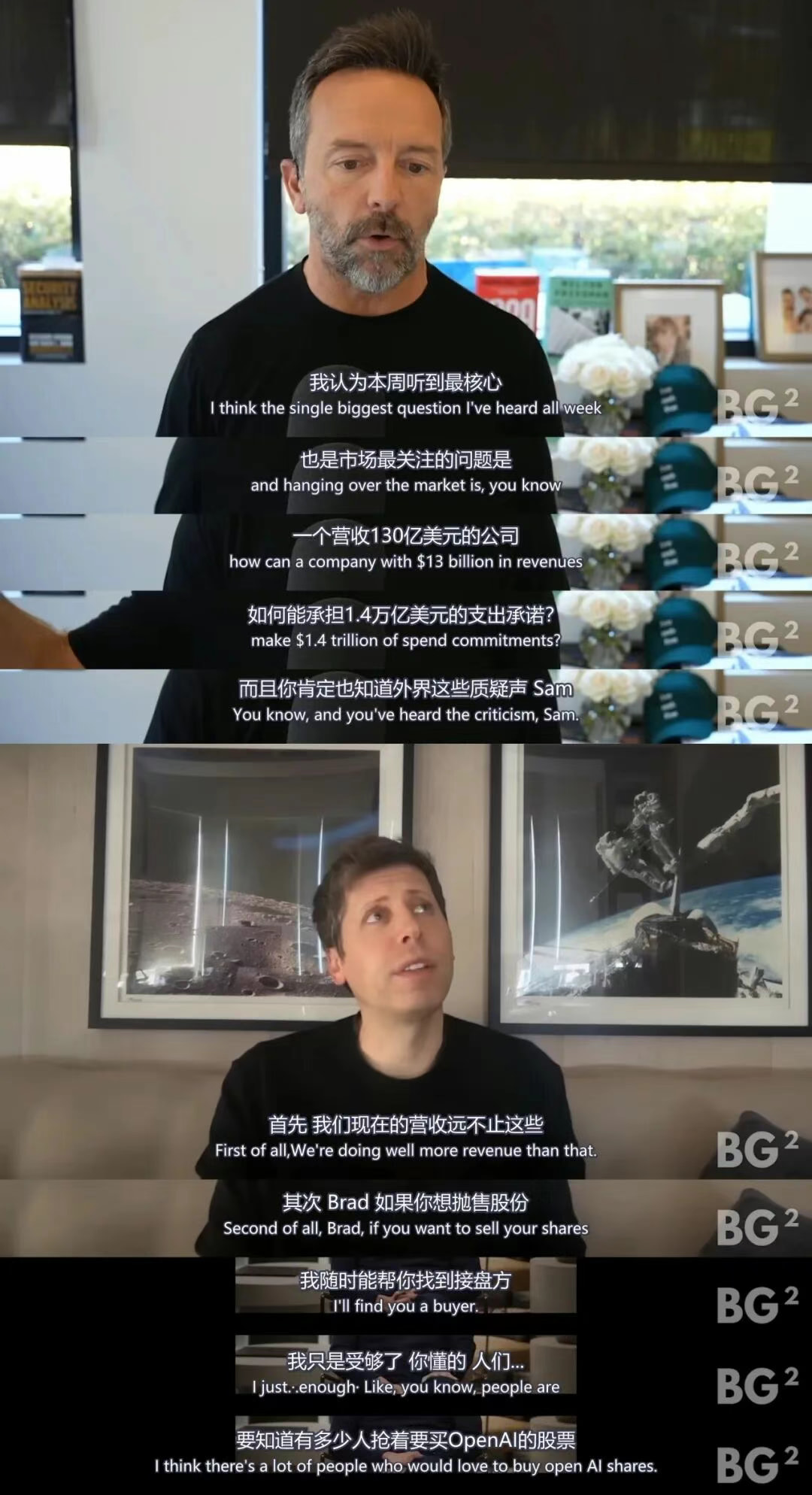 就在一个月前,OpenAI的投资人Brad Gerstner邀请OpenAI的创始人Sam Altman上自己的播客,并问出了行业里都很关心的一个问题,那就是目前每年收入130亿美金的OpenAI如何创造出支持1.4万亿美元支出承诺的巨大回报?