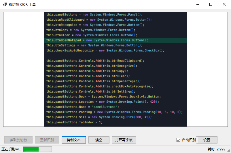 结果展示:用文本框显示识别结果,提供 “复制文本”“打开写字板” 按钮;