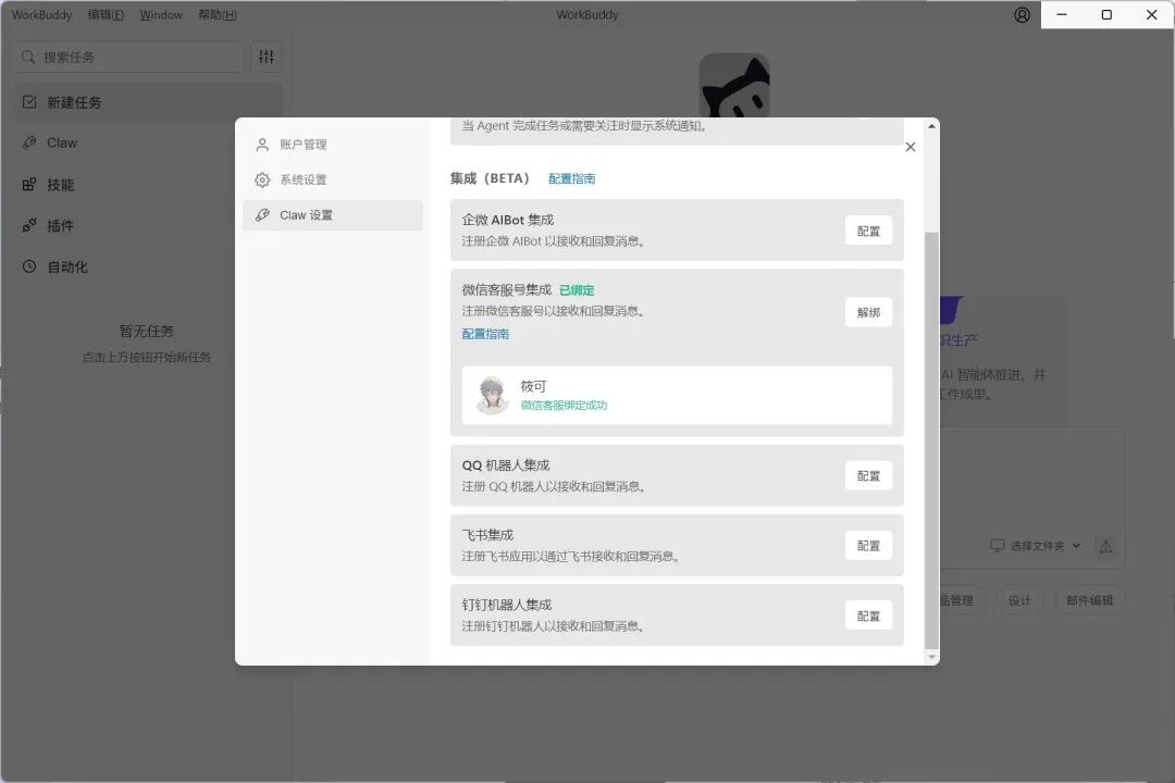 此时页面会出现绑定二维码,用微信扫码完成授权,绑定成功后,WorkBuddy 会显示你的微信头像和昵称,「微信客服号集成」右侧状态变为**「已绑定」**;