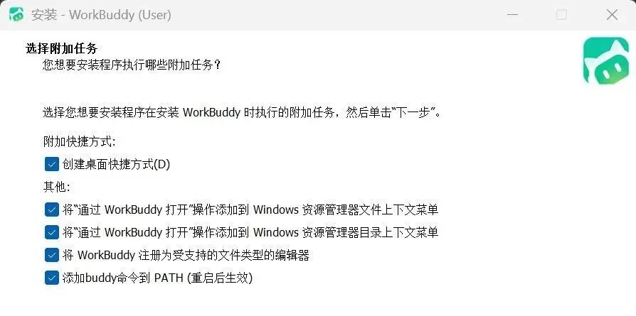 下载完成后安装流程默认推进即可,唯一需要注意**“选择附加任务”**这一步,建议将所有选项全选:包括创建桌面快捷方式、添加资源管理器右键打开入口、注册为文件编辑器、添加 buddy 命令到 PATH;